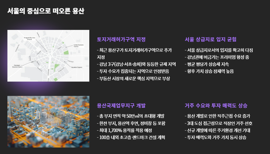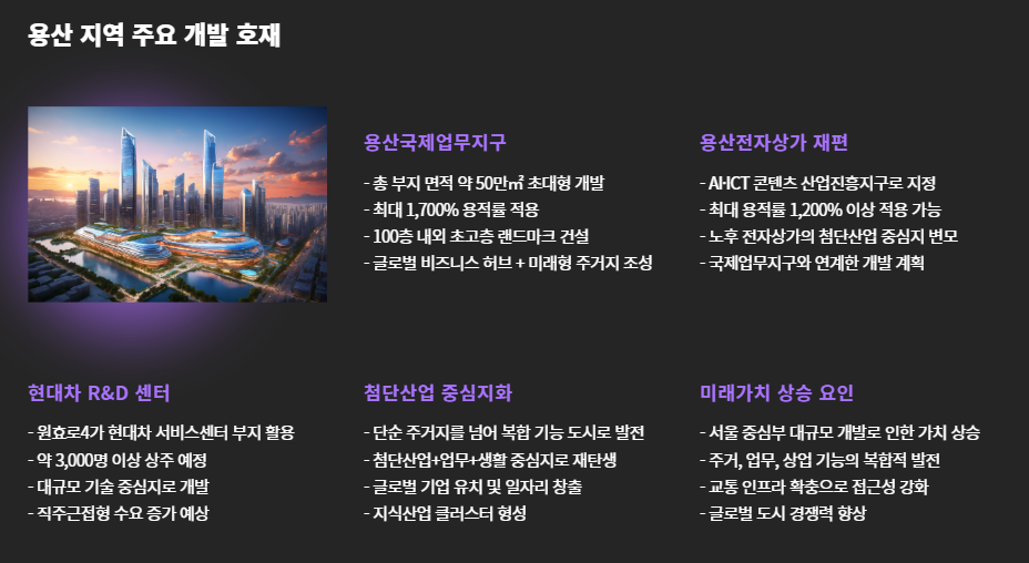 이로써 용산은 단순한 주거지를 넘어 첨단산업+업무+생활 중심지로 재탄생하게 됩니다.