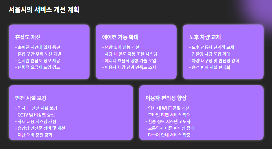 서울시는 지하철 혼잡도 개선, 에어컨 가동률 확대, 노후 차량 교체 등 서비스 개선도 병행하겠다고 밝혔습니다.