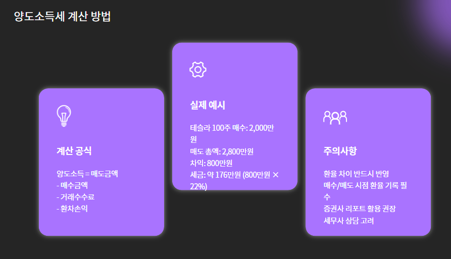 양도소득 = 매도금액 - 매수금액 - 거래수수료 - 환차손익