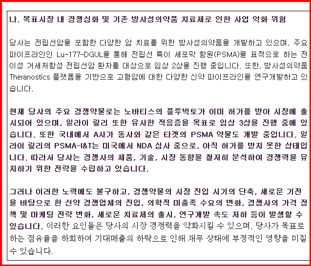 - 장점: 수요예측 결과가 양호하고, 글로벌 시장에서의 성장 가능성 있는 방사성의약품 기술을 보유.