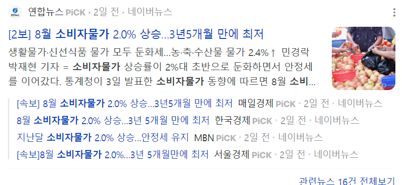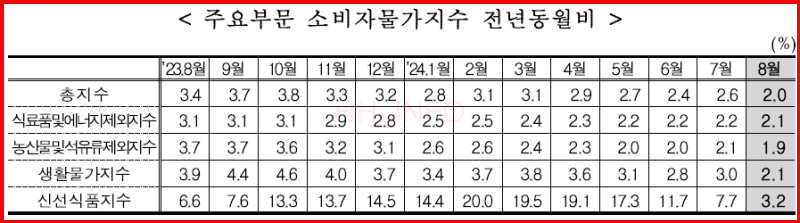 8월 소비자물가 2% 상승…일부 채소·과일 여전히 높아