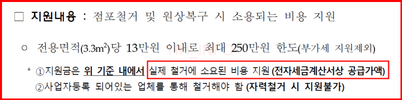 폐업지원금이라 불리는 점포 철거비는 최대 250만원까지 지원되며, 전용면적 기준으로 평당 13만원의 철거비용을 실비로 지원합니다. 지원금 신청을 위해서는 철거 업체에서 제공하는 공사내역서와 전표 내역(전자세금계산서, 카드 전표, 이체 확인증 등)을 제출해야 하며, 철거 전후 사진도 꼭 필요합니다.