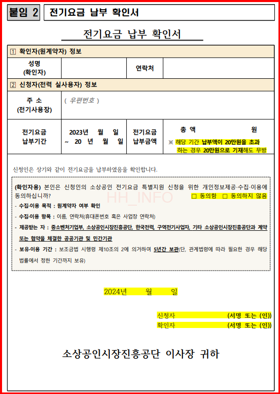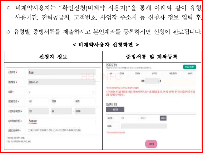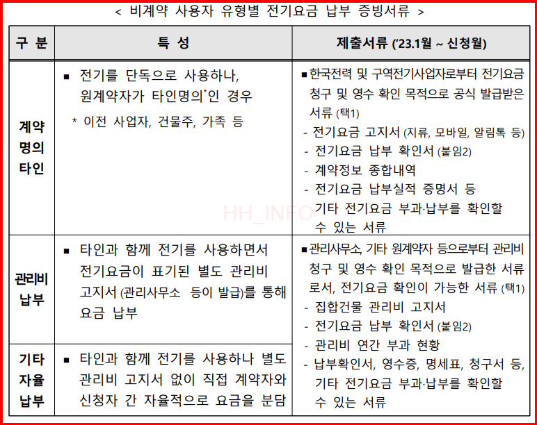 비계약 사용자는 추가 서류를 제출해야 합니다. 예를 들어, 전기요금을 타인 명의(건물주 등)로 납부하는 경우, 전기요금 납부 확인서 등의 서류를 제출해야 합니다. 관리비에 전기세가 포함된 경우에도 이를 증명할 수 있는 서류가 필요합니다.