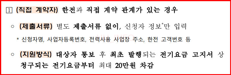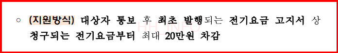 - 직접계약자(한전 고객번호 보유자): 전기요금에서 20만원 할인.