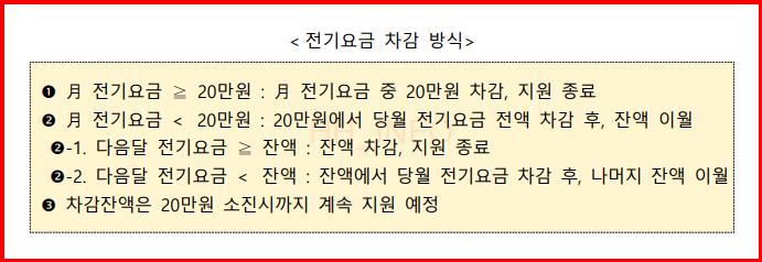 전기요금 20만원 지원은 대상자 통보 후 최초 발행되는 고지서에서 자동으로 차감됩니다. 만약 전기요금이 20만원을 넘을 경우, 차액만 지불하면 되며, 20만원 미만일 경우 잔액은 이월됩니다.