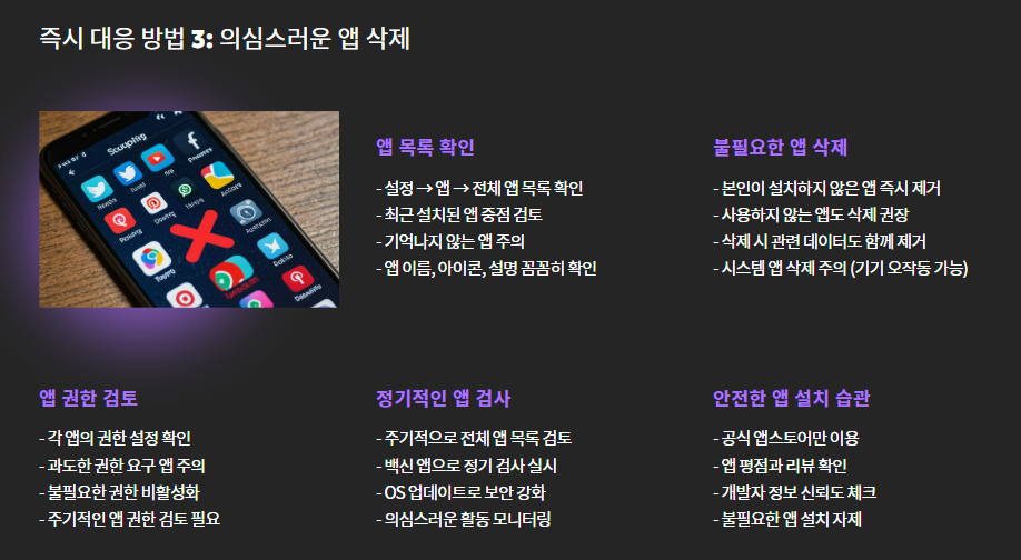- 설치된 앱 목록을 확인하고, 본인이 설치하지 않은 앱은 즉시 삭제하세요.