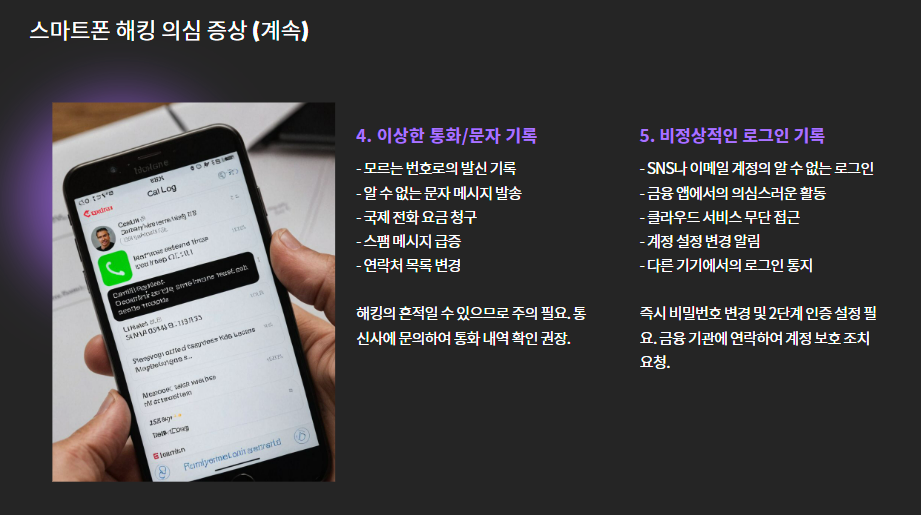 - 해킹이 의심될 경우, 통신사 고객센터(114 등)로 즉시 신고하세요.