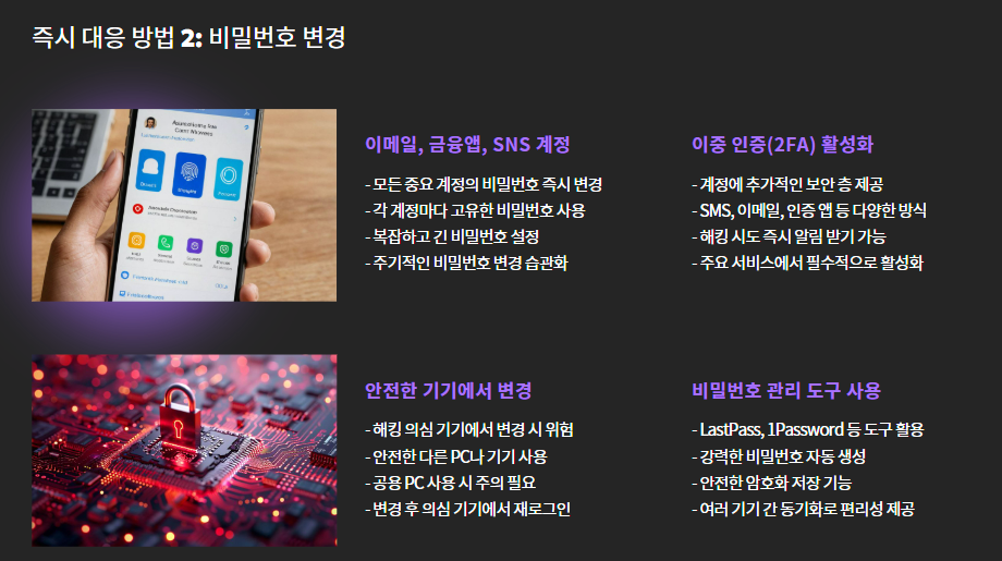 - 이메일, 금융앱, SNS 계정의 비밀번호를 빠르게 바꿔야 합니다.
