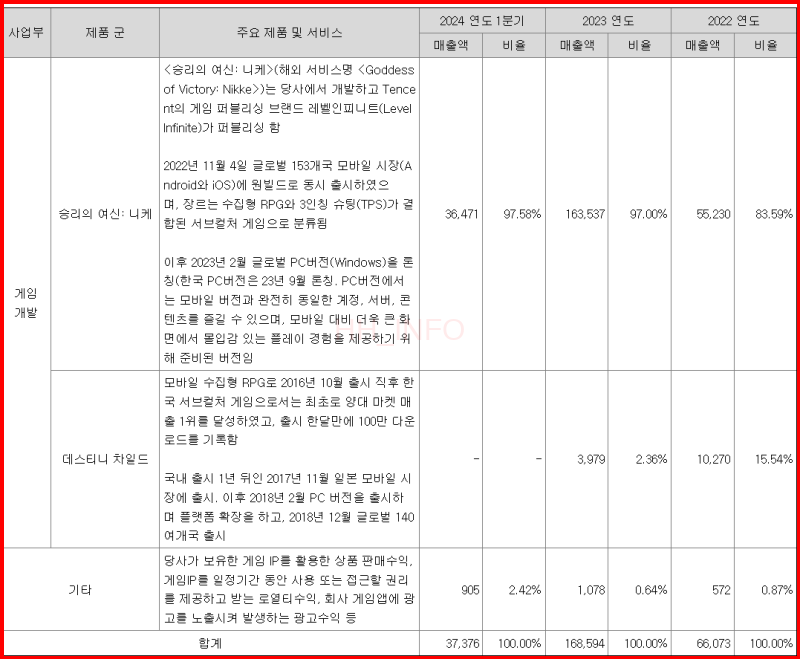 대부분의 매출은 현재 승리의 여신 니케에서 나오고 있습니다. 한때 매출을 책임지던 데스트니 차일드는 2023년부터 매출이 급감하였으며, 2024년 1분기부터는 매출 자체가 잡히지 않고 있습니다. 2022년 매출은 660억원, 영업이익은 182억원이었으나, 2023년에는 매출 1,685억원, 영업이익 1,110억원을 기록했습니다. 매출은 3배, 영업이익은 5배 이상 성장한 것입니다.