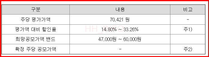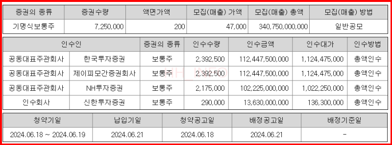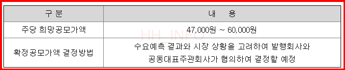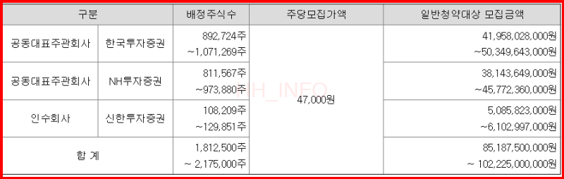 이번 공모주 청약의 대표 주관사는 한국투자증권과 NH투자증권입니다. 신한투자증권도 인수회사로 참여하고 있지만, 배정 물량이 적어 청약을 원하시는 분들은 한투나 농협을 선택하는 것이 좋습니다. 수수료 부분만 잘 체크하면 됩니다. (한투 2,000원, NH투자증권 2,000원, 신한 1,000원)