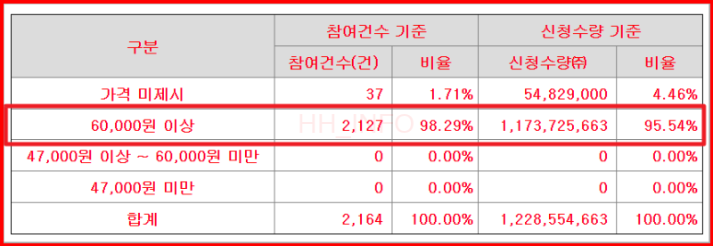 의무보유확약률은 32.98%로 매우 좋은 결과를 보였습니다. 이는 올해 공모주들의 평균 의무보유확약률인 11%에 비해 매우 높은 수준입니다. 참고로, HD현대마린솔루션의 의무보유확약률과 비교해보면 조금 낮지만 여전히 높은 수치입니다.