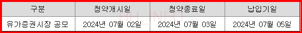 우리사주조합이 없어 배정수량이 없고 기관투자자에 75% 5,437,500주, 일반투자자에 25% 1,812,500주를 실권 없이 배정 완료했습니다. 일반청약에서 18조5억 원의 증거금이 몰리며 한국투자증권, NH투자증권은 균등 1주, 34%, 36%의 확률로 최대 2주를 배정받았고 신한투자증권은 88%의 확률로 1주를 배정받았습니다. 2024년 상반기 대어였던 HD현대마린솔루션 다음으로 많은 증거금이 몰렸던 청약이었습니다.