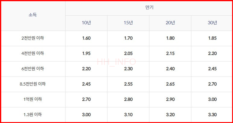 대출 금리는 주택 구매자의 소득 및 추가적인 우대조건에 따라 결정되며, 일반적으로 매우 낮은 금리가 적용됩니다.