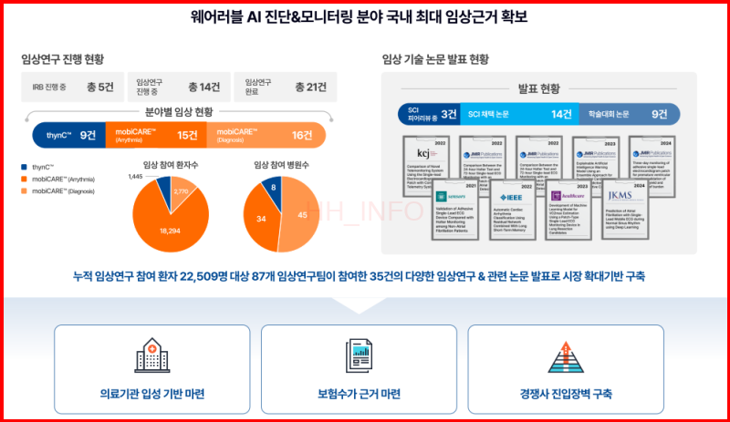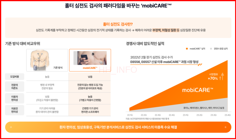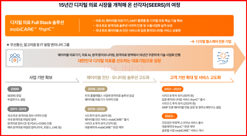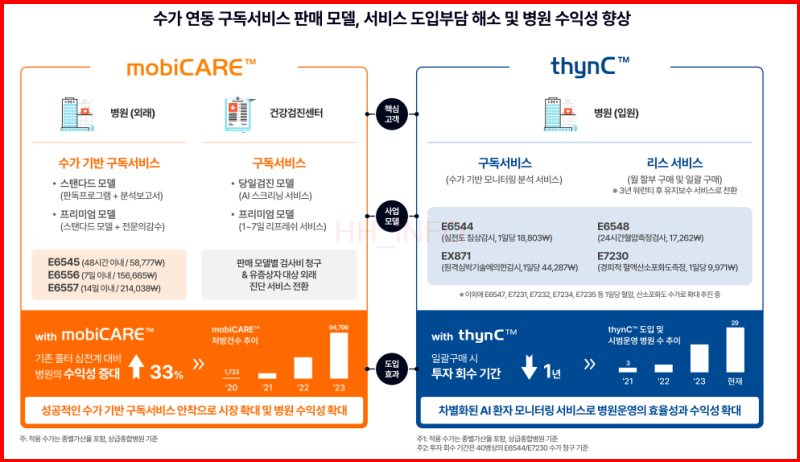 2009년에 설립된 씨어스테크놀로지는 외래환자 대상 심전도 분석 및 건강검진 부정맥 검사 서비스인 모비케어와 환자의 생체신호를 실시간으로 모니터링하는 씽크 서비스를 주요 제품으로 하고 있어요. 모비케어는 웨어러블 의료기기를 통해 생체신호를 측정하고 AI 판독 알고리즘으로 진단을 지원해줘요. 특히 '홀터 심전도 검사' 솔루션으로 기존 심전도 검사 대비 높은 편의성과 수익성을 제공한답니다.