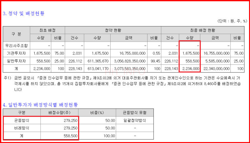 총 청약 건수는 22만 6112건이 접수되었습니다. 이를 균등물량으로 나누면 약 1.235주가 되어, 청약에 참여한 모든 분들은 최소 1주를 받았고, 약 24%의 청약자들은 추가로 1주를 더 받았습니다. 저 역시 비례 배정으로 3주를 받았고, 아이도 1주를 받았습니다.