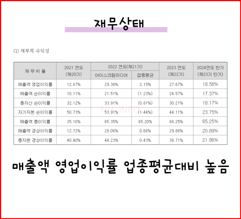 아이스크림미디어의 매출액은 2021년부터 꾸준히 성장하고 있으며, 영업이익 또한 흑자를 기록하고 있습니다. 특히, 영업이익률이 2021년 12.67%에서 2023년 27.67%로 크게 상승하였으며, 이는 업종 평균을 상회하는 높은 수치입니다.