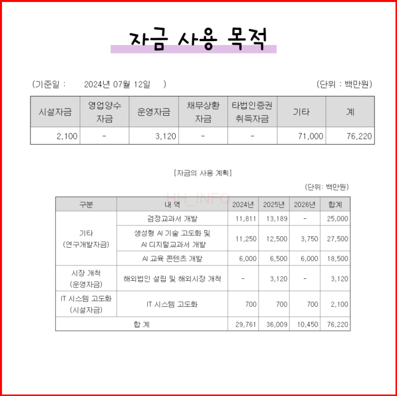 이번 공모를 통해 유입된 자금은 주로 시설, 운영, 기타 자금으로 사용될 예정입니다. 특히, 2025년 해외 진출을 목표로 하고 있어 글로벌 시장 진출을 위한 기반을 마련하고자 합니다. 이는 저출산으로 인해 국내 교육 시장의 성장이 한계에 달할 것을 대비한 전략으로 보입니다.