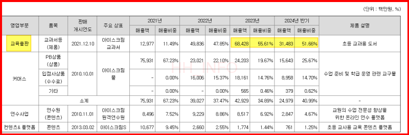 아이스크림미디어는 교육 콘텐츠 기반의 에듀테크 회사로, 초등학교 수업을 지원하는 플랫폼인 '아이스크림s'를 운영하고 있습니다. 전국 초등학교 학급수 기준으로 전체 교사 수의 약 93%가 이 플랫폼을 사용하고 있다고 합니다. 매출 구조를 살펴보면, 교육출판에서 가장 큰 비중을 차지하며, 커머스, 연수사업, 콘텐츠 플랫폼이 그 뒤를 잇습니다.