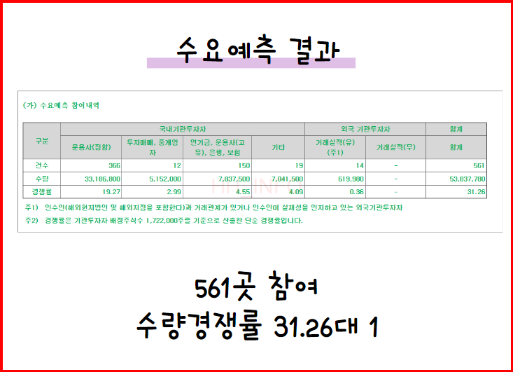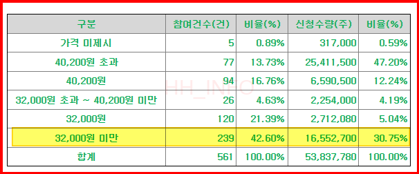 아이스크림미디어의 수요예측에는 총 561곳의 기관투자자가 참여했으며, 수량 경쟁률은 31.26대 1로 집계되었습니다. 이는 최근 공모주 수요예측 결과 중에서도 매우 낮은 수준입니다. 특히, 신청가격 분포를 보면 희망 공모가가 32,000원~40,200원으로 설정되었지만, 32,000원 미만으로 참여한 비율이 40%를 넘었습니다. 이에 따라 공모가는 밴드 하단인 32,000원으로 확정되었습니다. 이는 수요예측이 흥행에 실패했음을 시사하며, 투자자들에게 신중한 접근이 필요함을 보여줍니다.