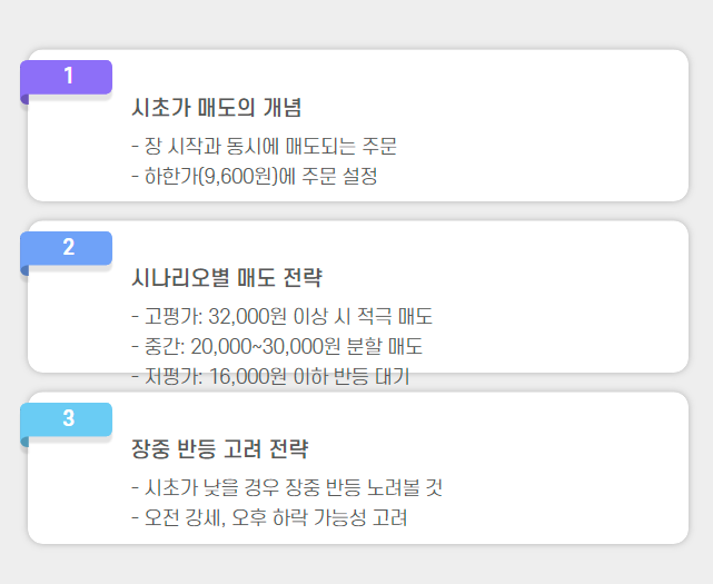 Tip: 하지만 시초가가 낮게 형성될 경우 장중 반등을 노리는 것도 좋은 전략입니다.