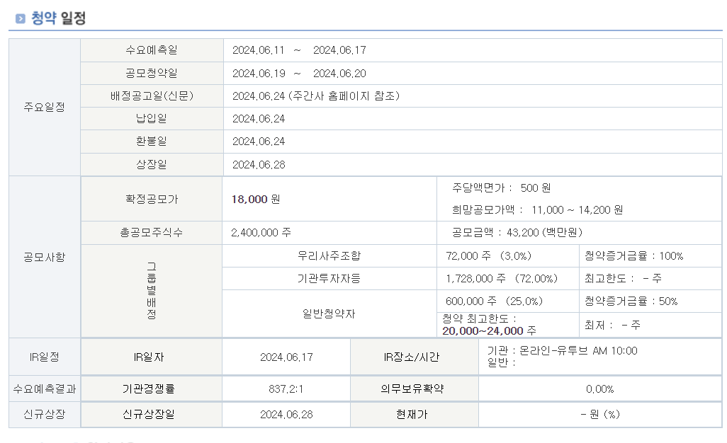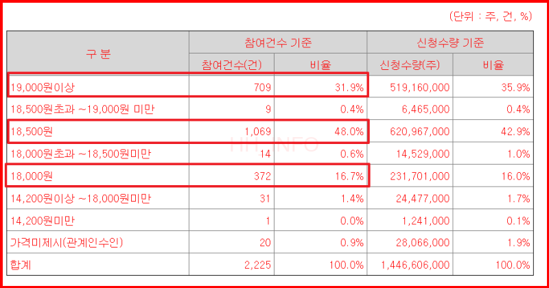 수요예측 신청가격 분포를 보면 18,000원을 적어낸 기관들의 비율이 16.7%, 그리고 18,500원은 48%로 나왔어요. 희망공모가 밴드가 11,000원~14,200원이었는데, 수요예측이 흥행하면서 상단을 초과해 18,000원으로 확정되었어요. 요즘은 다 상단초과 느낌이죠?