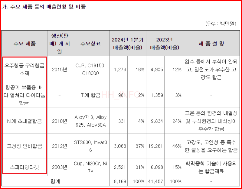 에이치브이엠은 첨단금속 제조 전문기업이에요. 제품은 우주, 항공, 자동차, 의료기기 등 다양한 분야에서 특수목적으로 사용된답니다. 2023년 매출액 비중 중에서는 고청정 인바합금 비중이 높아요. 석유/반도체/전기전자 쪽 매출 비중도 높고, 2020년도부터는 인도로 수출도 시작했어요. 항공 쪽으로도 비중을 늘려나가고 있답니다.