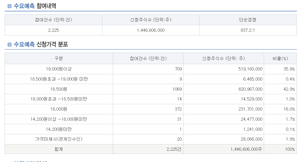 에이치브이엠의 수요예측 결과가 정말 흥행했어요! 기관투자자 총 2225곳이 참여했고, 수량 경쟁률은 무려 837.2 대 1이었답니다.