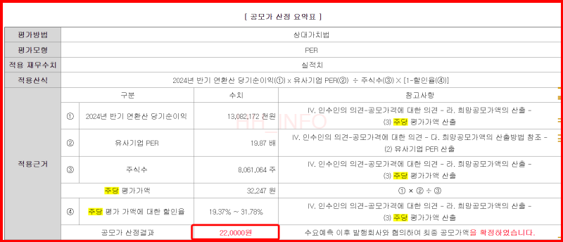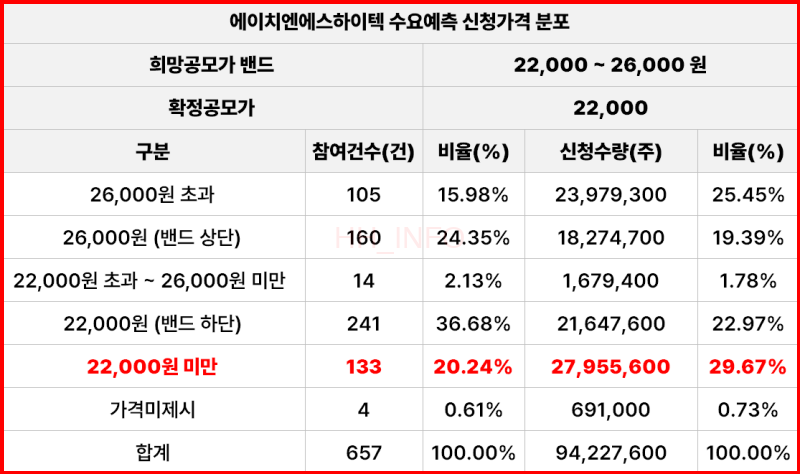 수요예측 참여 기관의 36.7%가 공모가 하단을 제시하였으며, 참여 기관 수 또한 657곳으로 일반적인 공모보다 적은 편입니다. 이로 인해 공모가는 밴드 최하단인 22,000원으로 확정되었습니다.
