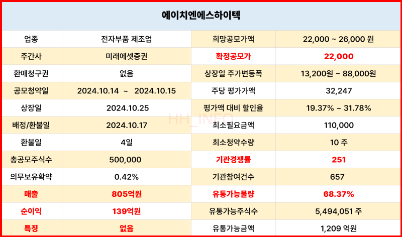 에이치엔에스하이텍은 수정진동자를 제조하는 기업으로, 이를 통해 안정적인 매출과 영업이익을 창출하고 있는 중소기업입니다. 하지만 이번 공모에서 높은 유통 가능 물량과 낮은 의무보유확약 비율로 인해 공모 흥행 가능성은 낮아 보입니다.