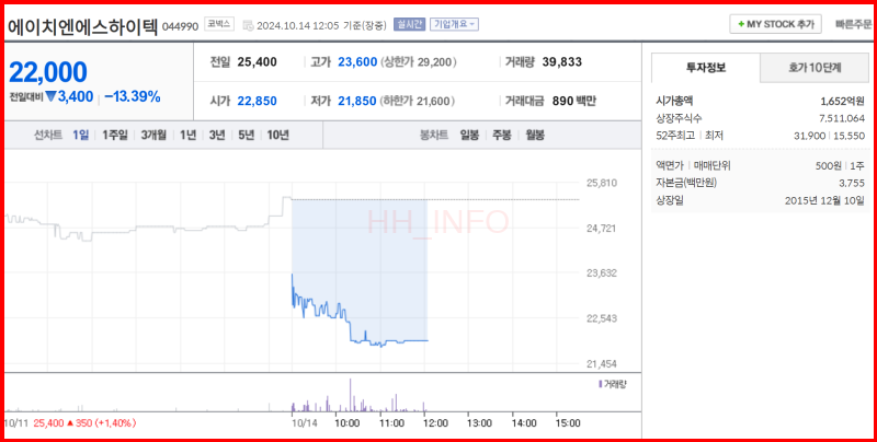 코넥스 시장에서 에이치엔에스하이텍의 주가는 공모가와 유사한 22,000원 수준으로 하락했습니다. 기존 주주들이 상장 후 일정 부분 매도를 통해 수익 실현을 할 가능성이 크기 때문에, 상장 후 주가 변동에 주의가 필요합니다.