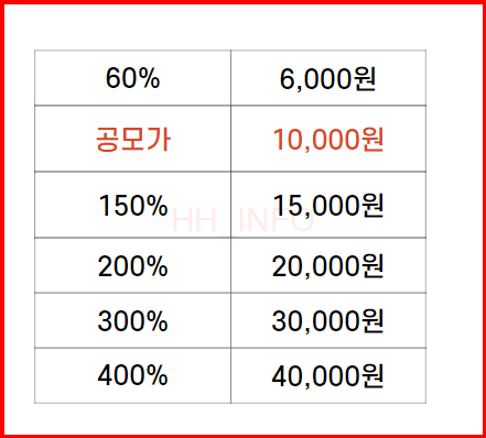 - 상장일 주가 범위: 6,000원~40,000원 (공모가의 60%~400%)