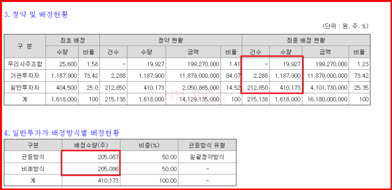 - 일반투자자 배정 주식: 410,173주 (균등 배정: 205,087주, 비례 배정: 205,086주)
