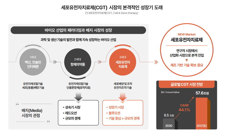 2015년에 설립된 엑셀세라퓨틱스는 세포치료제로 대표되는 첨단 바이오 의약품의 핵심 소재인 세포 배양 배지를 개발 및 제조하는 바이오 기업입니다. 주력 제품은 3세대 화학조성 배지 셀커(CellCor)입니다. 이 회사는 세계 최초로 3세대 배지라 불리는 무혈청 화학조성 배양배지 기술을 확보했습니다.