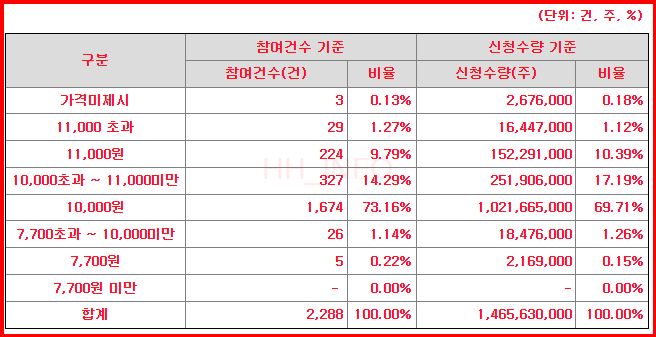 - 수요예측 결과: 총 참여 건수는 2,288건이며, 단순 경쟁률은 1,233.8:1입니다. 공모가 밴드는 6,200~7,700원이었으며, 확정공모가는 10,000원으로 정해졌습니다.