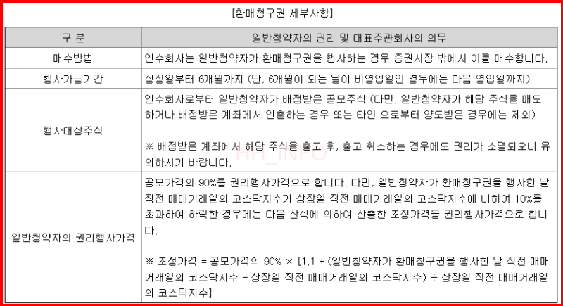 - 환매청구권: 공모가격의 90%로 6개월 환매청구권을 부여합니다. 청약으로 받은 주식만 해당 권리가 있으며, 타 계좌로 이동 시 권리 소멸됩니다.