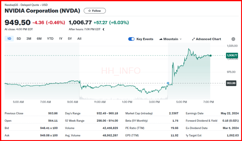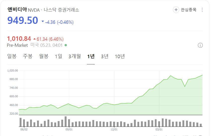인공지능 시대의 최고 주식으로 꼽히는 엔비디아가 최근 놀라운 소식을 전했습니다. 시장 예상치를 뛰어넘는 분기 실적을 발표한 것뿐만 아니라, 10대 1의 주식분할까지 발표하면서 주가가 급등했습니다. 정규장에서는 약간의 하락이 있었지만, 시외 거래에서는 무려 6.03%가 상승하면서 주가는 1006달러에 도달했습니다.