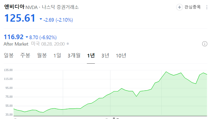 2분기 실적을 발표한 후, 엔비디아 주가가 28일(현지시간) 장외에서 폭락하고 있다. 전년대비 122%의 매출 성장을 기록했지만, 지난 3분기 연속 200%대 성장을 보인 것과 비교하면 성장이 둔화됐다