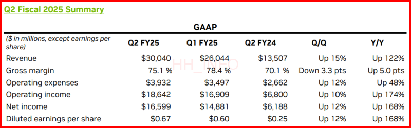 엔비디아는 회계연도 2025년 2분기에 300억 달러의 매출을 기록했습니다. 이는 전분기 대비 15%, 전년도 대비 122%의 엄청난 상승을 나타냅니다. 순이익 역시 전분기 대비 12%, 전년도 대비 168% 상승하며, EPS(주당 순이익)는 0.67달러로 작년에 비해 약 3배 가까이 증가했습니다.