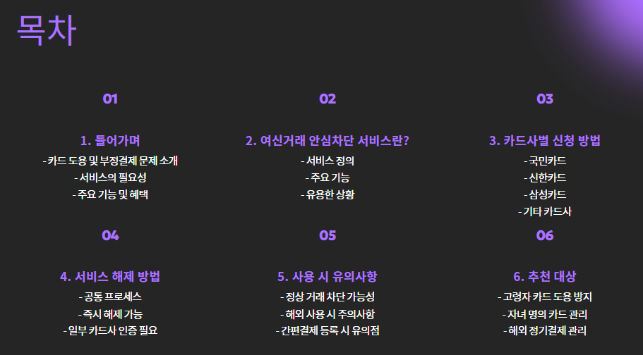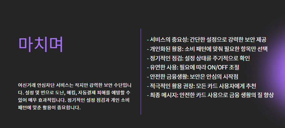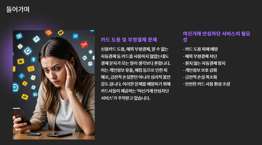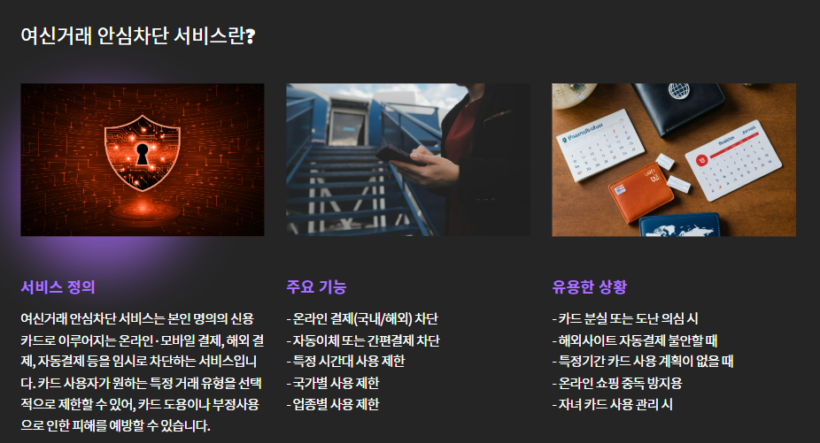 이런 피해를 막기 위해 카드사들이 제공하는 서비스가 바로 **"여신거래 안심차단 서비스"**입니다.