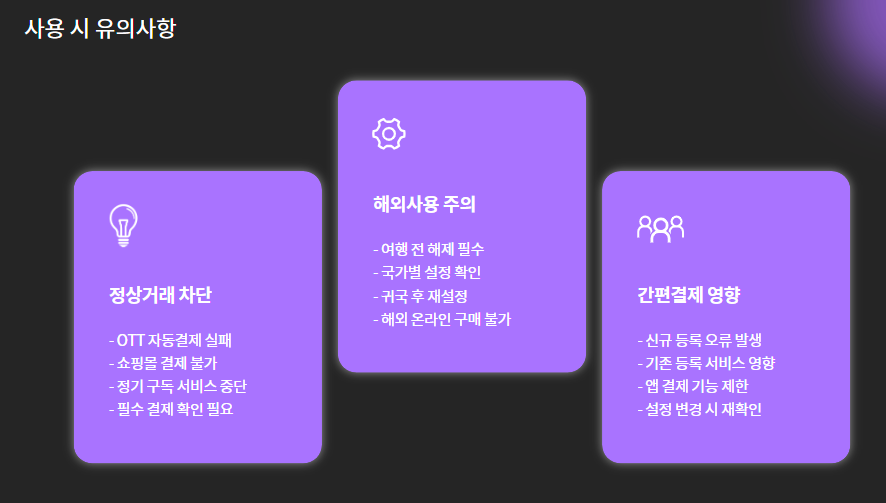 - 정상 거래까지 차단될 수 있음: OTT 자동결제, 쇼핑몰 결제 실패 가능