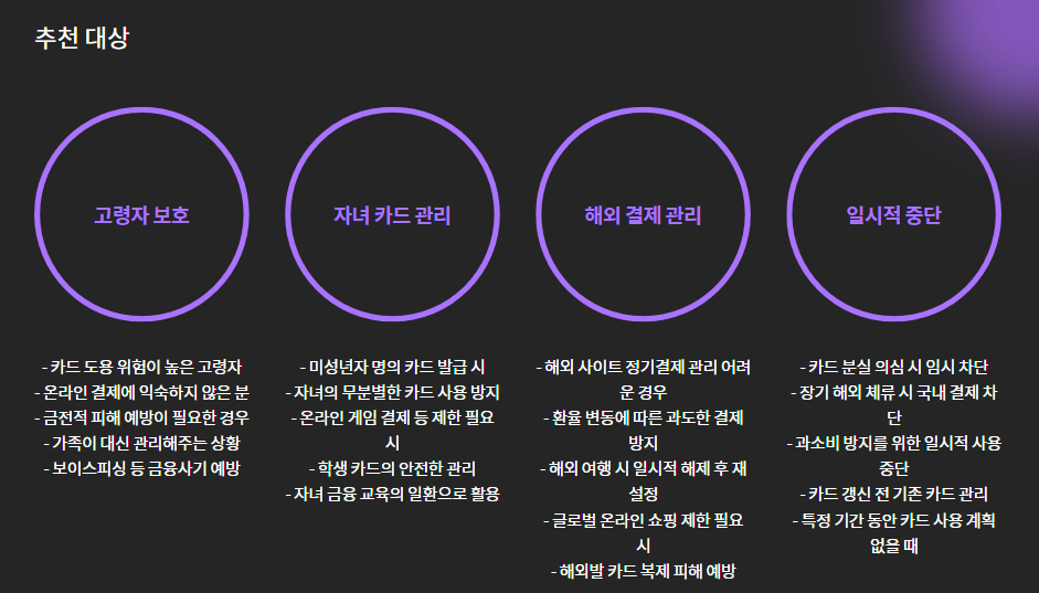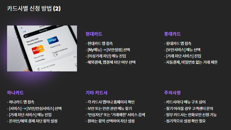 - 해외 사용 시 미리 해제 필요: 해외여행 전 차단 해제하지 않으면 결제 불가