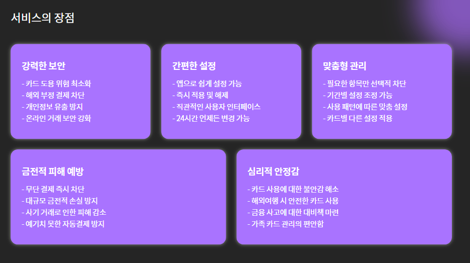 본인 명의 신용카드로 온라인·모바일 결제, 해외 결제, 자동결제 등을 임시로 차단하는 서비스입니다.