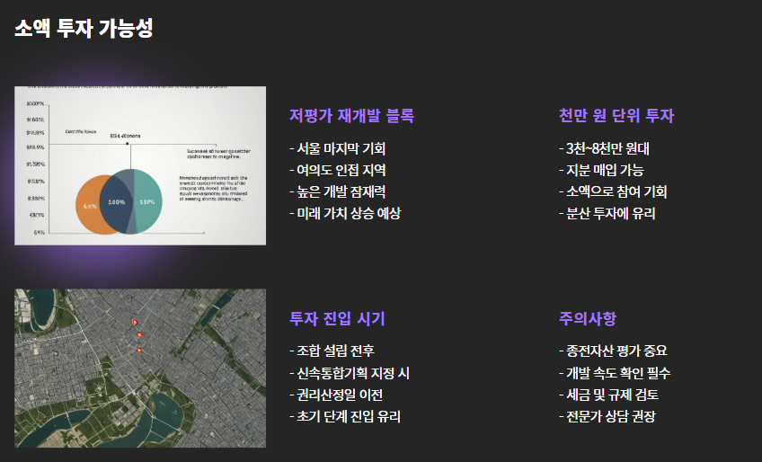 - 단점: 재개발 진행 시 종전자산 평가에 따라 수익률 달라짐