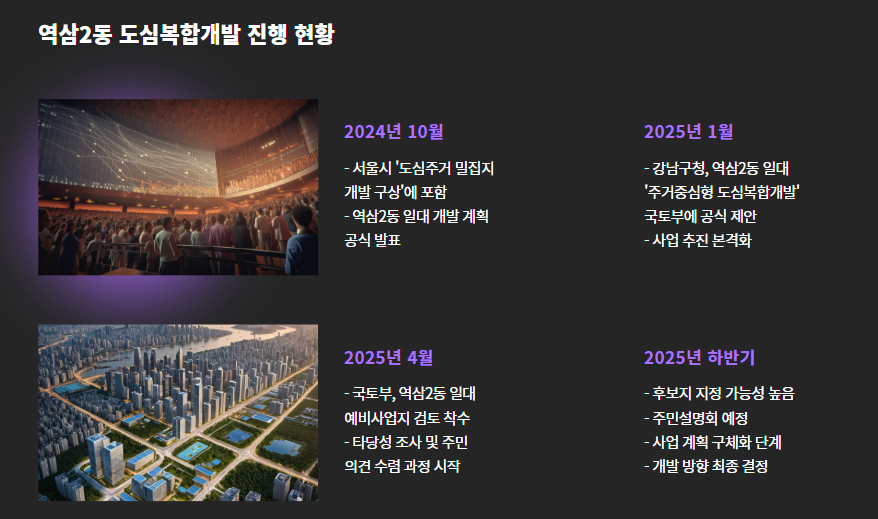 | 2025년 1월 | 강남구청, 역삼2동 일대 ‘주거중심형 도심복합개발’ 국토부 제안 |