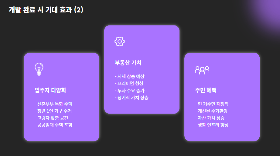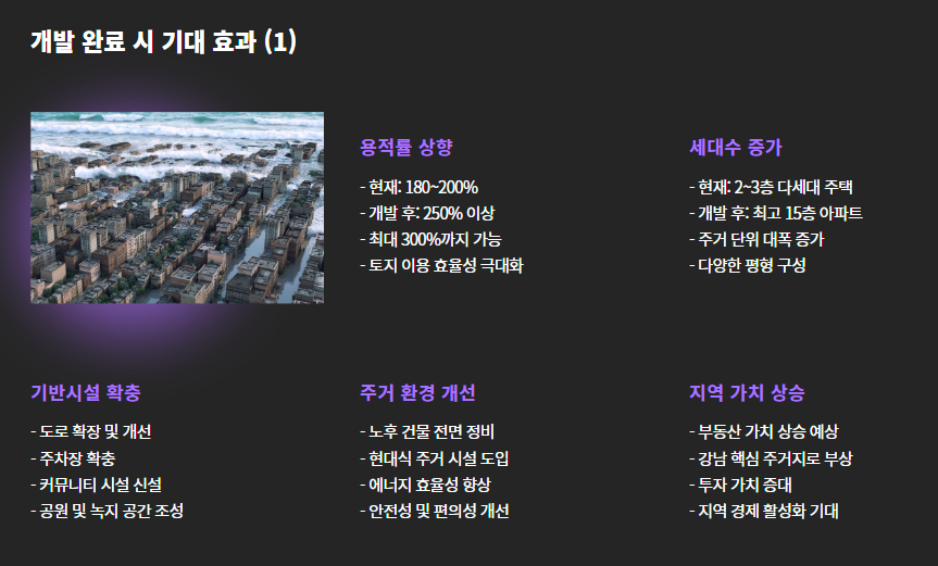 | 기반시설 확충 | 도로, 주차장, 커뮤니티 시설 등 함께 개선 |