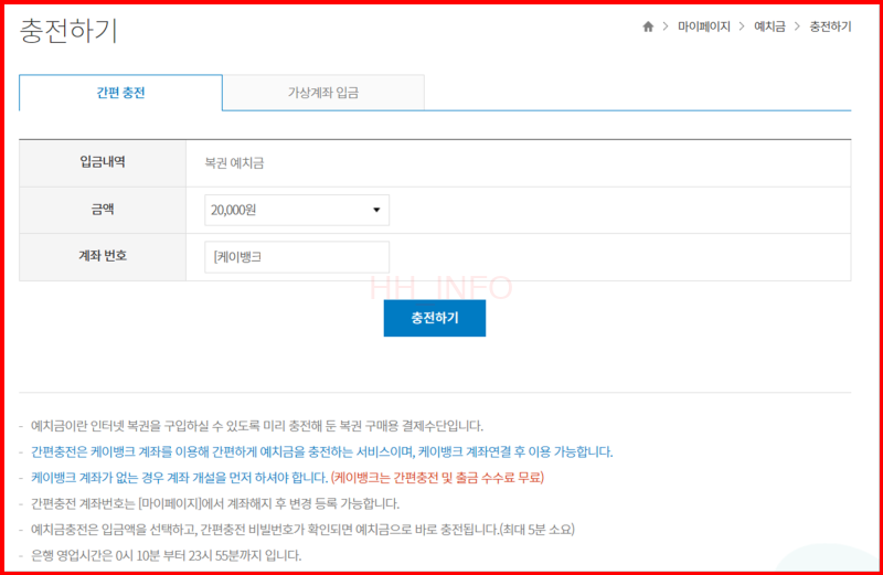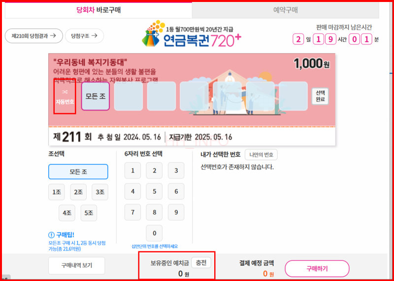 예치금 충전은 케이뱅크를 연결하거나 케이뱅크의 가상계좌에 입금하는 방식으로 이루어집니다. 최소 충전금액은 5천원이고 최대 충전금액은 100만원까지 가능합니다. 충전 후에는 복권 번호를 선택하여 구매할 수 있습니다.