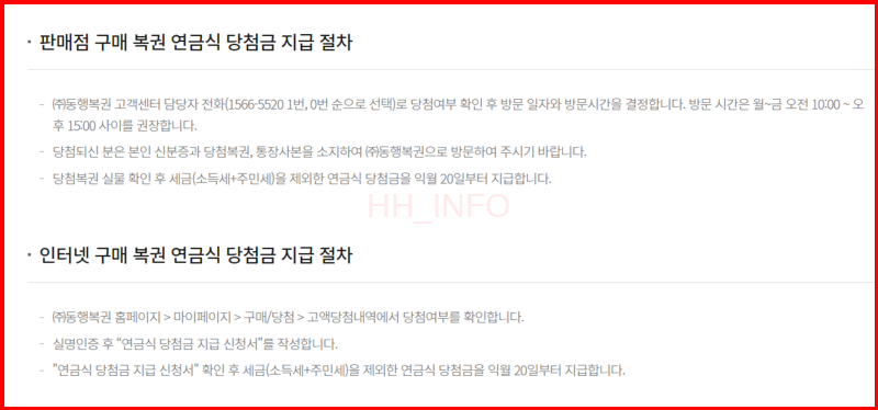 1등의 경우 700만원씩 20년간, 2등의 경우 100만원씩 10년간 수령하게 됩니다. 당첨금은 세금이 공제된 후에 지급되며, 지급기한까지 수령하지 않을 경우 복권기금으로 귀속됩니다.