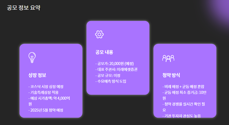 | 공모 청약 | 비례 + 균등 병행, 미래에셋증권 단독 주관 예정 |