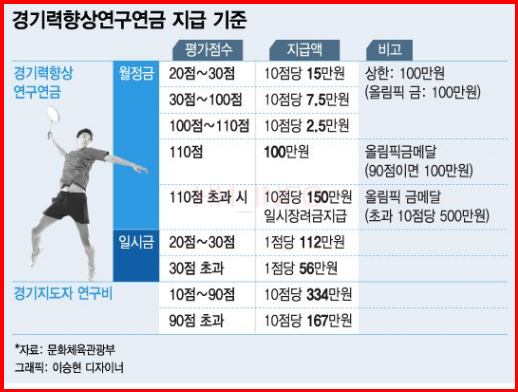 선수들은 연금 점수를 쌓아 월 연금을 받을 수 있으며, 점수가 계속 쌓이면 최대 월 100만원까지 받을 수 있습니다. 예를 들어, 금메달을 획득한 선수는 90점의 연금 점수를 받아 최대 월 100만원을 받게 됩니다.