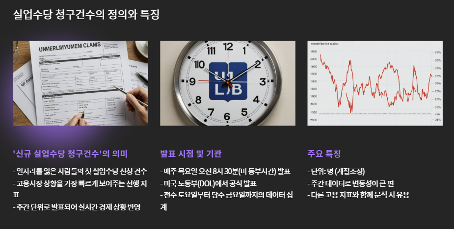 우선 기초부터 간단히 짚고 갑니다. **‘신규 실업수당 청구건수’**는 일자리를 잃은 사람들이 처음으로 정부에 실업수당을 신청한 건수를 의미하며, 고용시장 상황을 가장 빠르게 보여주는 선행 지표입니다.
